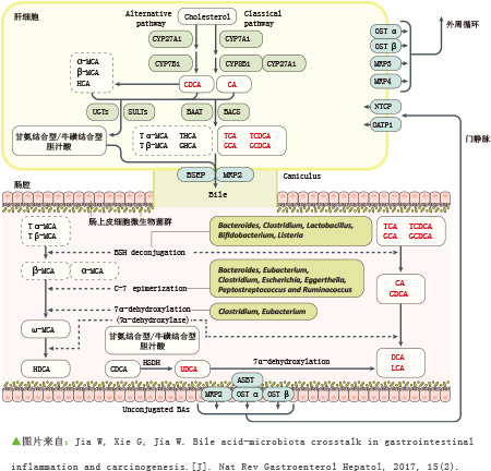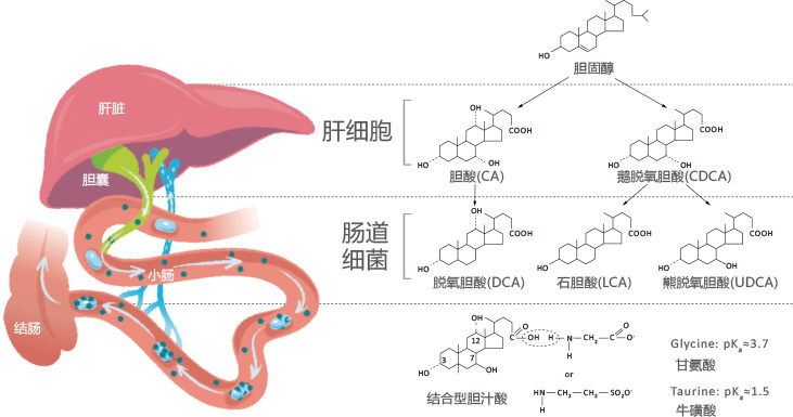 膽汁酸是一大類膽烷酸的總稱,在脂肪代謝中起著重要作用。膽汁酸的生理功能可概括為:影響膽汁分泌、促進(jìn)腸道對(duì)脂類物質(zhì)的吸收并影響腸道功能。膽汁酸作為消化液的組成部分之一是由肝合成并隨膽汁排入腸內(nèi),促進(jìn)對(duì)脂類物質(zhì)的消化和吸收。主要包括膽酸、鵝脫氧膽酸、脫氧膽酸、石膽酸、熊脫氧膽酸等及其甘氨酸和?;撬峤Y(jié)合型。